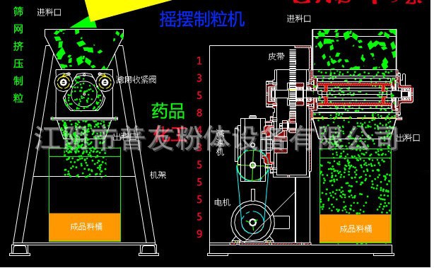 搖擺顆粒機是一種將潮濕粉末混合物在旋轉滾筒的正、反旋轉作用下,強製性通過篩網而製成顆粒的專用設備。
