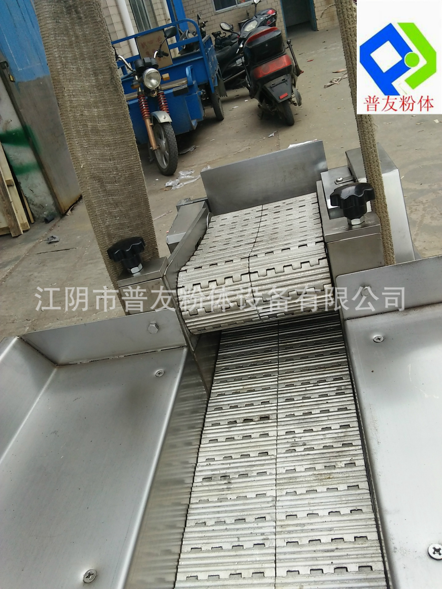 偏心機構旋轉時,通過滑槽與連桿的作用,帶動五星輪間歇性轉動,這樣再通過三級齒輪的傳動,將動力傳至鏈輪軸,使上下輸送鏈同步相向間歇運動,從而將處於上下輸送鏈間的物料送至刀門。這樣,一方麵刀架在持續的上下運動,另一方麵需切藥物隨輸送鏈被動入刀門,從而實現連續切藥的目的。其中五星輪上有進、退、停三檔,其傳動是通過五星輪內的滾子間歇的受擠壓,放松來帶動的,當切藥中途停頓,並推出刀內的物料時,應先停機,再將五星輪手柄撥至退檔,並將未切物料退出刀門。