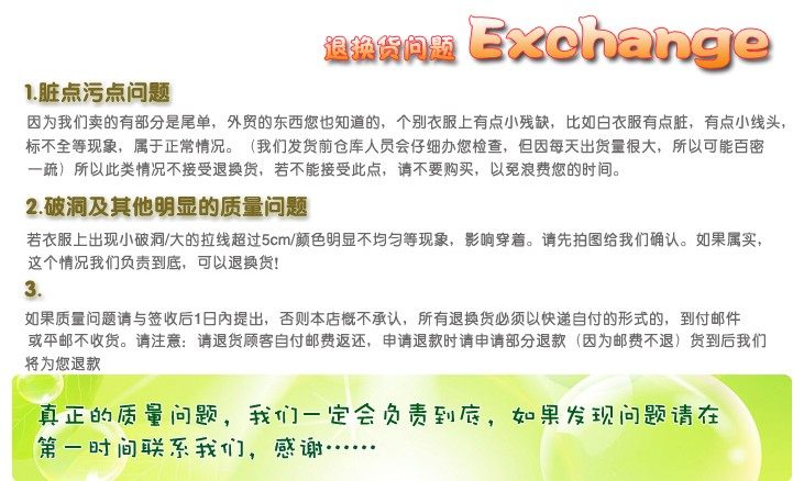 | | 1.本店所有圖片均為實物拍攝(由於掌櫃的拍照技術不是太好,所以實特絕對比圖片好看喲),由於拍攝時的光線和電腦顯示器的顯示原因,圖片與實物的顏色可能稍有差別,以實物為準.若對小色差非常在意的買傢請慎重. 本店所有的商品均為小額批發價出售,如果確實需要大的訂單,請與掌櫃聯系喲!! 2.因為貨物流動量大,所以拍前請詢問是否有貨,以免影響到大傢的購物心情,造成雙方不愉快. 3.本店所售產品,品質保證,絕不參假,絕不虛報克重,材質 4.收到貨後如果沒有問題,請盡快確認好評,我們也是急需要資金周轉的。如果有任何問題,請先聯系我們,不要隨便給出中差評。是我們的錯誤我們一定會承擔,但首先親們要給我們這個機會,謝謝!