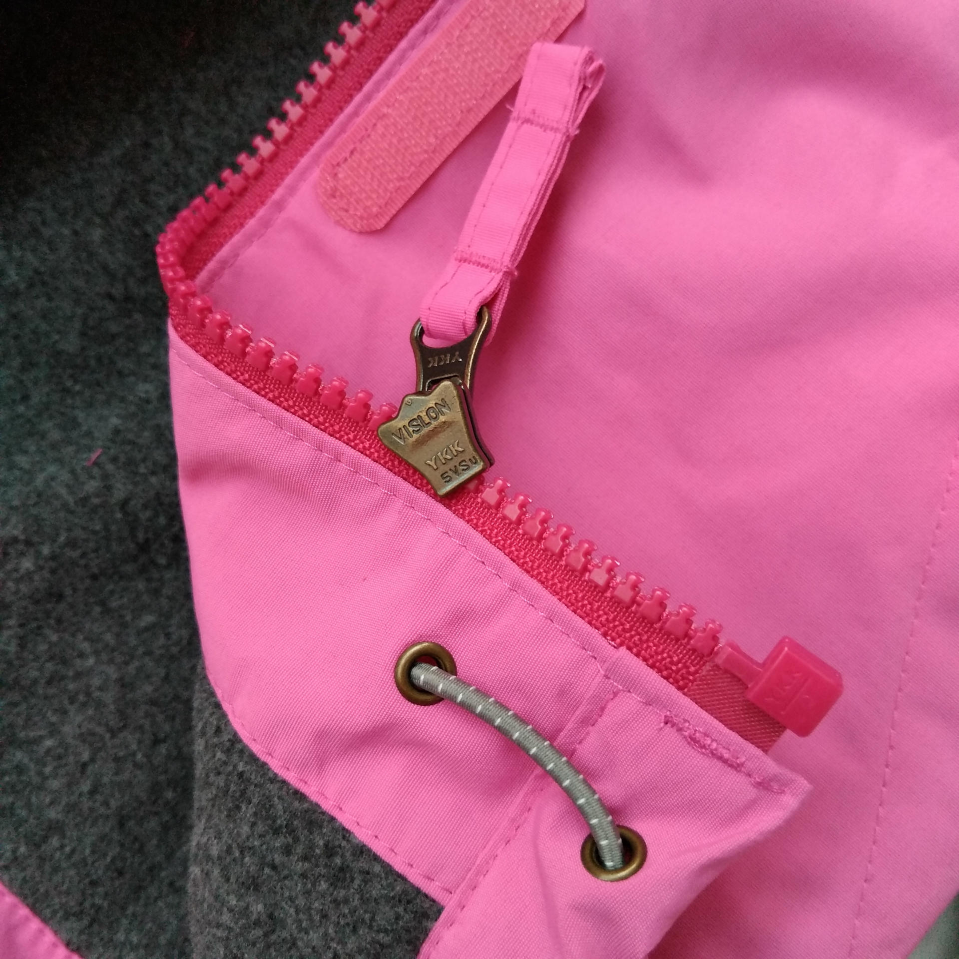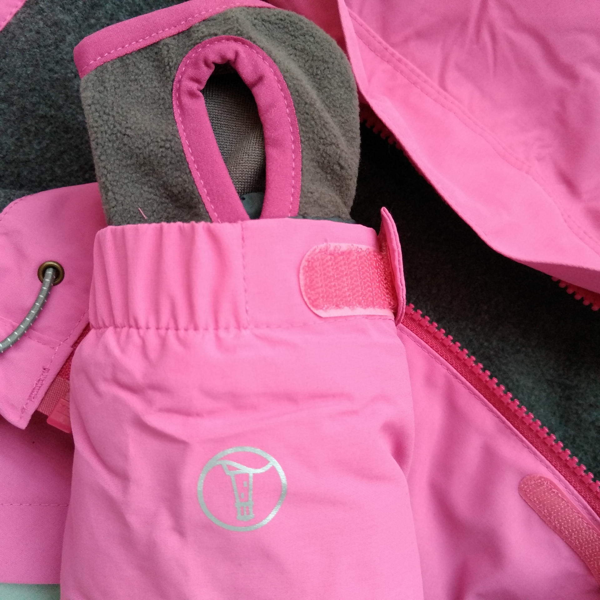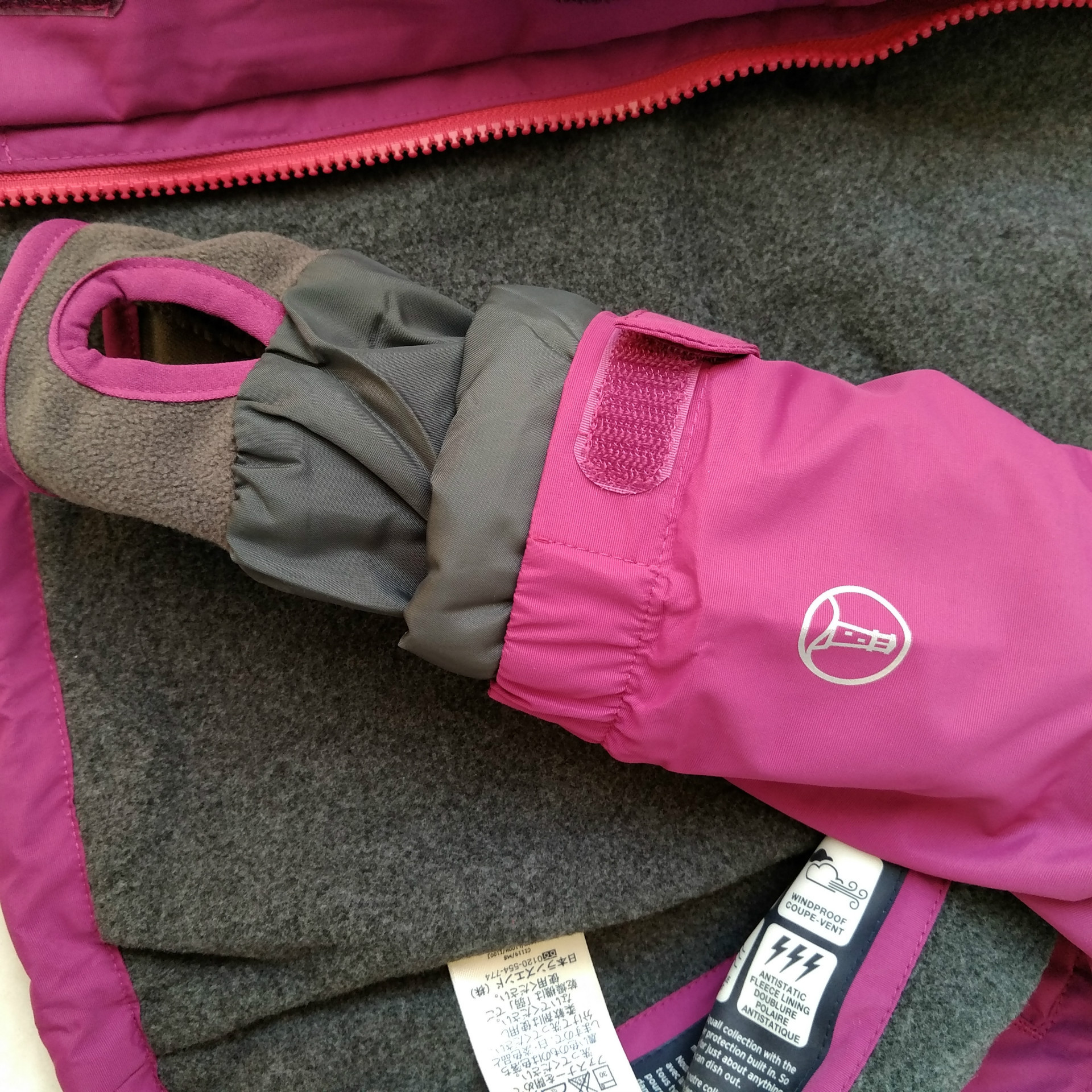 另有一個特點就是此款戶外服袖子裡麵折疊縫起來一塊,等孩子長高點瞭可以拆開線放出來,就變成一件大衣服瞭。仿單貨是不會做的這麼精細入微的,隻有外貿原單貨要求嚴格,設計才這樣貼心考究。
