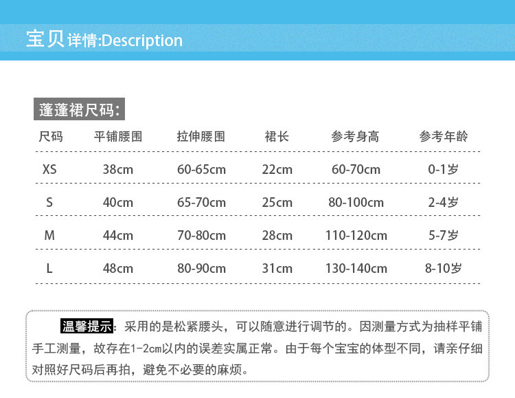 此款蓬蓬裙由兩層網紗,一層裡佈組成。大身麵料為100%錦綸,柔軟蓬松不易起皺,適合小朋友柔軟的皮膚。上身很仙哦,是小公主們日常生活,舞臺表演和PARTY著裝的最好選擇。