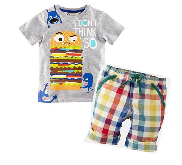 【名稱】:2015新款夏季新款男童漢堡搞怪圖案格子褲套裝