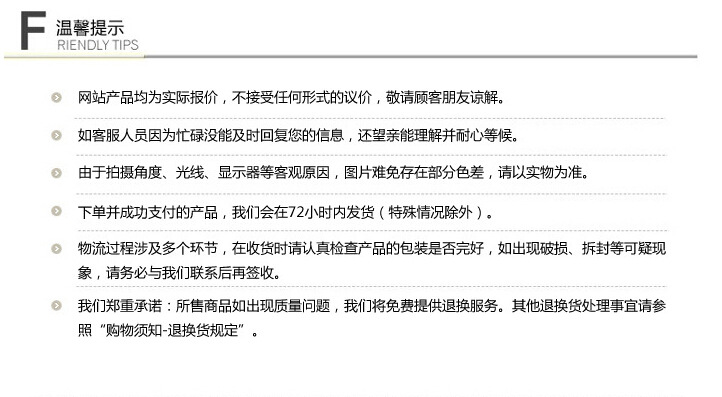為瞭保證本店品牌信譽,在本店拿貨的產品,不允許出現自行再生產、再加工等情況。