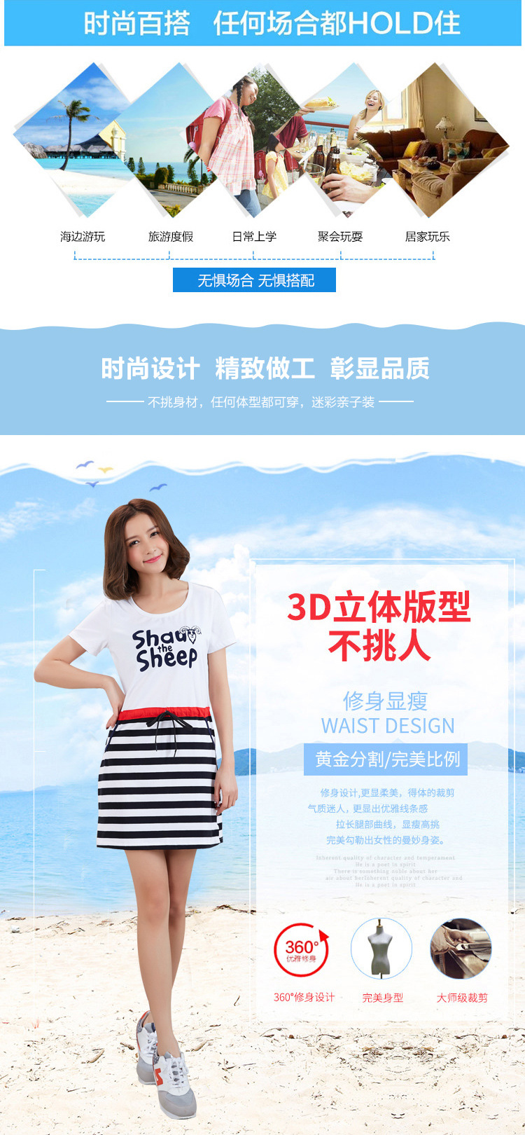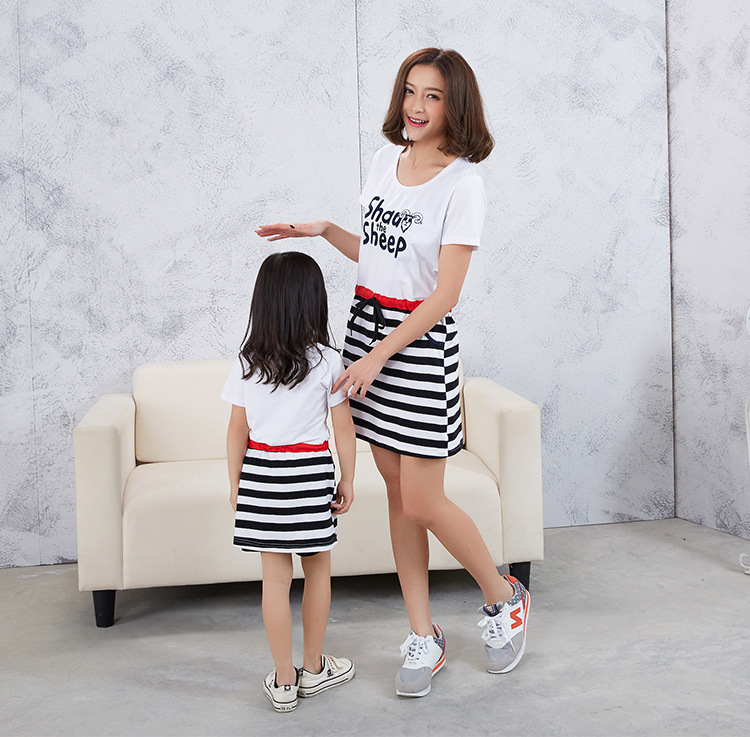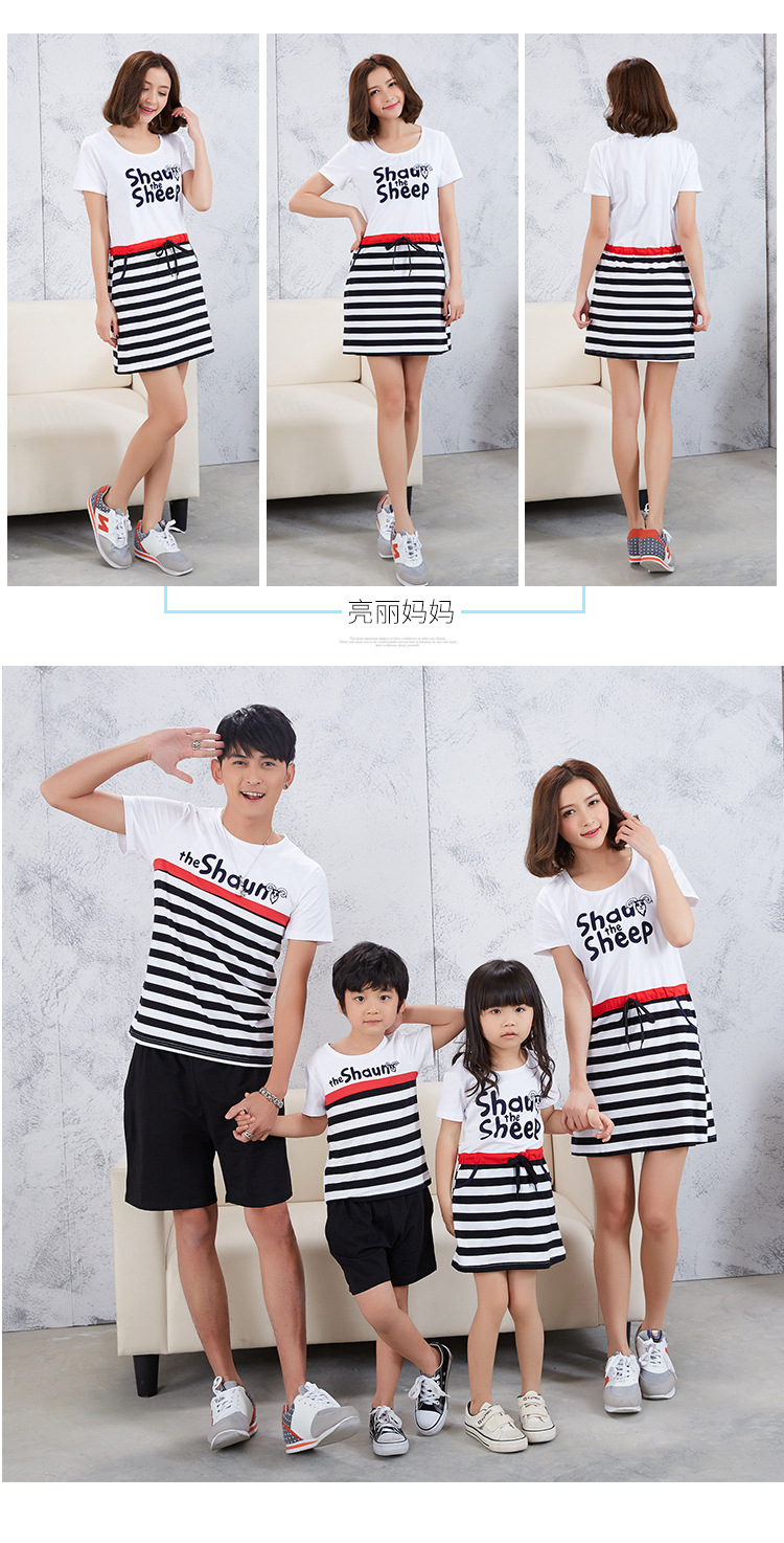 親子裝夏裝2016新款休閒黑白條紋純棉t恤一傢三口母女裙傢庭裝