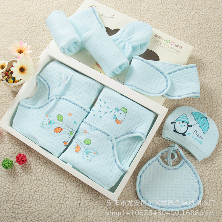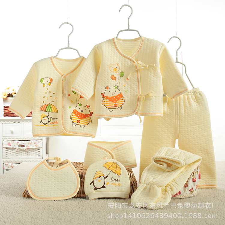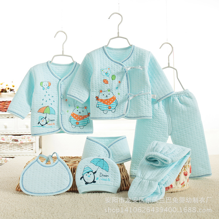 備註:一件系繩上衣,一件對門系扣上衣,兩條褲子(一條兩用檔開腳褲+一條兩用檔包腳褲),一個圍嘴, 一頂帽子,一條肚圍共7件 可以通用的包裝袋降低成本也可以要禮盒