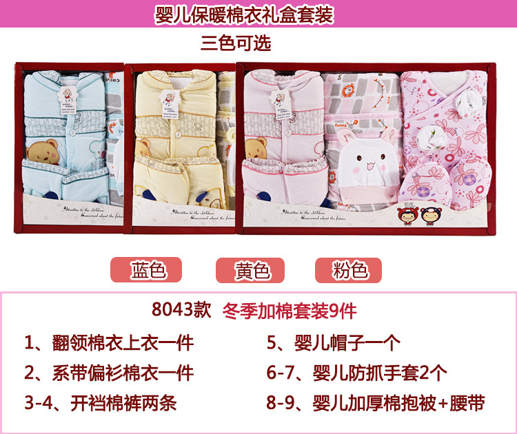 禮盒明細:翻領開身棉上衣一件 、系帶和尚棉衣一件、開檔棉褲2條 、純棉嬰兒帽子一個、嬰兒防抓手套2個 、嬰兒加厚棉抱被1件 、抱被系帶一條 共9件