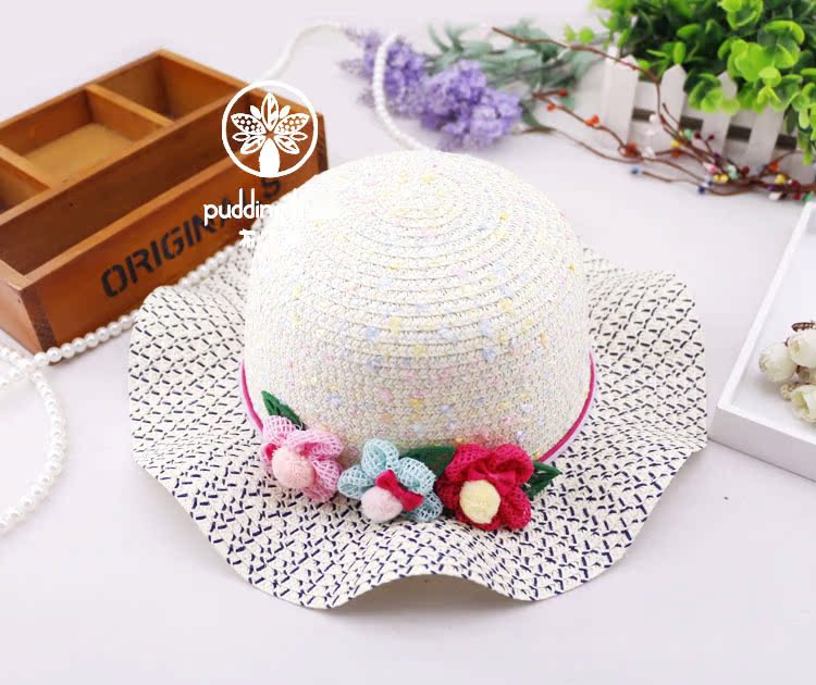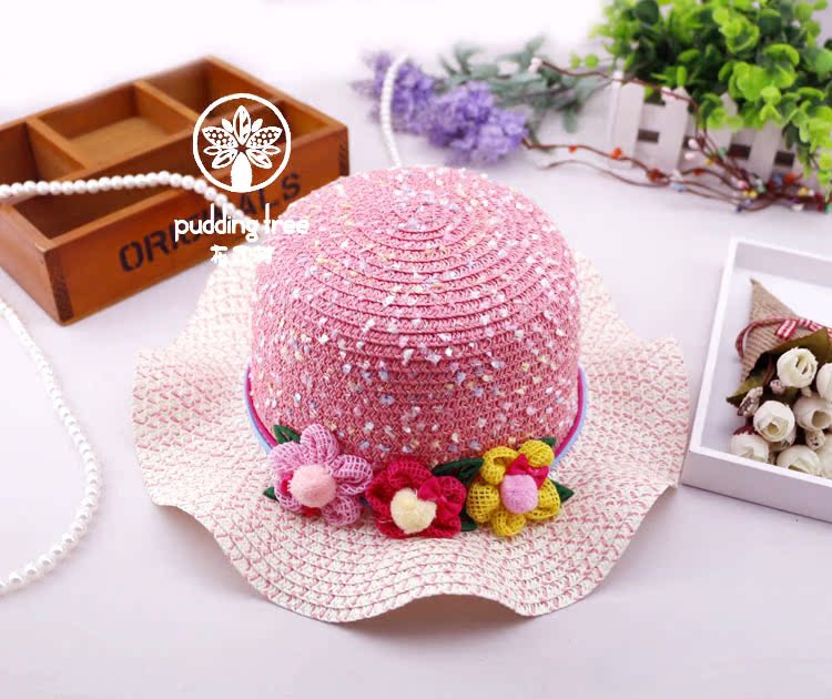 產品名稱:HT-1638 三朵絨花兒童草帽女童遮陽帽子夏季 女孩沙灘帽2016