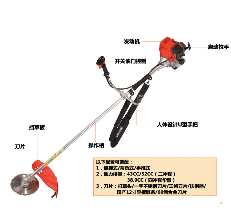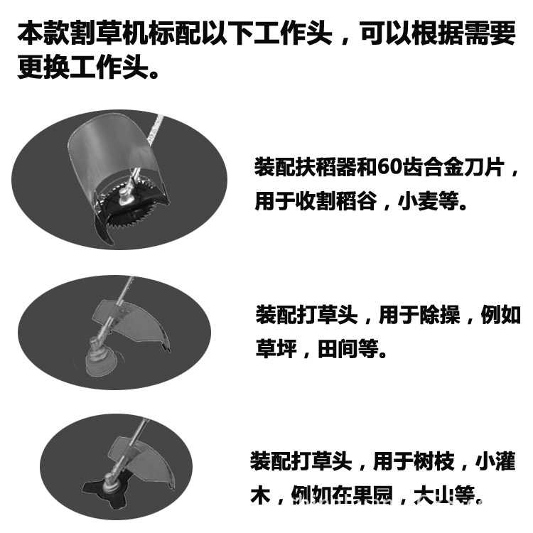 工作頭:尼龍打草頭,60齒合金刀片,三齒刀片,扶稻器