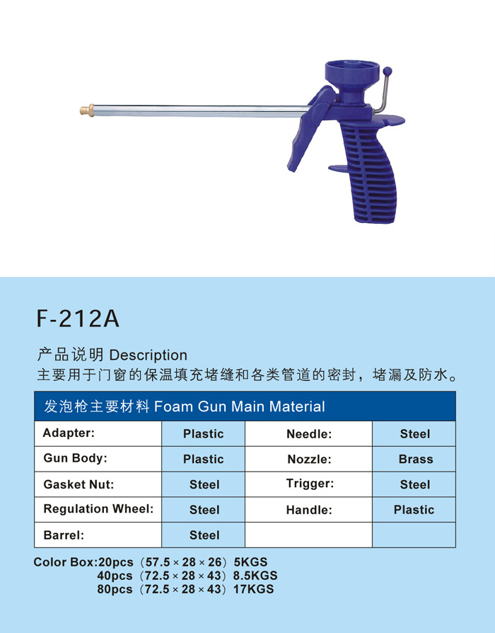 F-212A發泡膠噴槍主要用於門窗的保溫填充堵縫和各類管道的密封,堵漏以及防水。製造材料以銅為主。