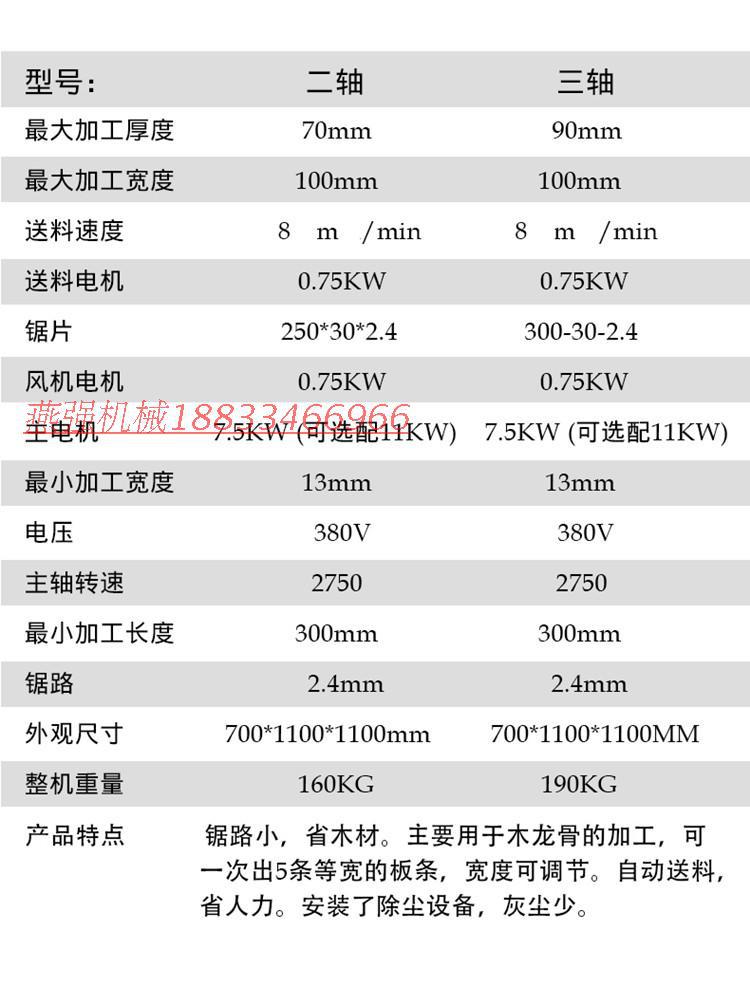 產品簡介: 本機是一臺專業加工規格板材的多片鋸機械,加工規格可以隨意調節,最薄加工厚度可以達到4MM,切出的板材尺寸標準,誤差在0.3MM之內,表麵光滑,無需再 刨,節省工序。操作簡單,普通人工即可操作,加工效率高,平均每小時出成品2方半左右,一臺多片鋸可以抵四臺傳統帶鋸產量,替企業大量節省人工費用, 長度,外形,重量,功率,鋸片,等參數根據定製尺寸型號而定。 產品具有送料順暢、加工精細、不燒鋸片、高工效,低耗材、環保、安全性強等優點,適用於乾料和濕料加工,是各種板材加工成型的理想設備。產品適用於杉木、松木、按木、楊木等較軟雜木。是做指接板,細木工板,櫃子板,床板,建築傢具木方等最理想的設備。