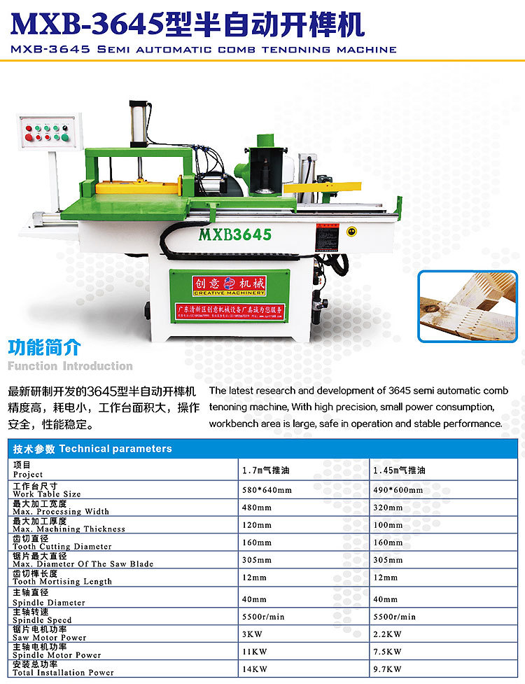 一. 適用范圍及技術特點: MXB-3645型梳齒榫開榫機,是一種用於木材縱向接合的機械。對於材質一般甚至不良的木板,通過該機器接合後再加工變形小,性能優於普通板材,這就可以大大提高木材利用率,減少浪費,達到短材長用,劣材優用的目的。 二. 技術參數: 最大加工寬度 | 320mm | 梳齒榫高度 | 12mm | 最大加工高度 | 100mm | 齊頭鋸片直徑 | 305mm | 開齒刀頭直徑 | 160mm | 齊頭鋸片電機 | 2.2kw | 開榫刀頭電機 | 7.5kw | 側汽缸型號 | QGA50*80/80*80 | 氣源壓力 | 0.4-0.6Mpa | 推料汽缸型號 | QGA40*50 | 垂直汽缸型號 | QGA63*150 | 導軌長度 | 1450cm | 機床外形尺寸 | 1500*1280*1300 | 主軸轉速 | 5500r/min |