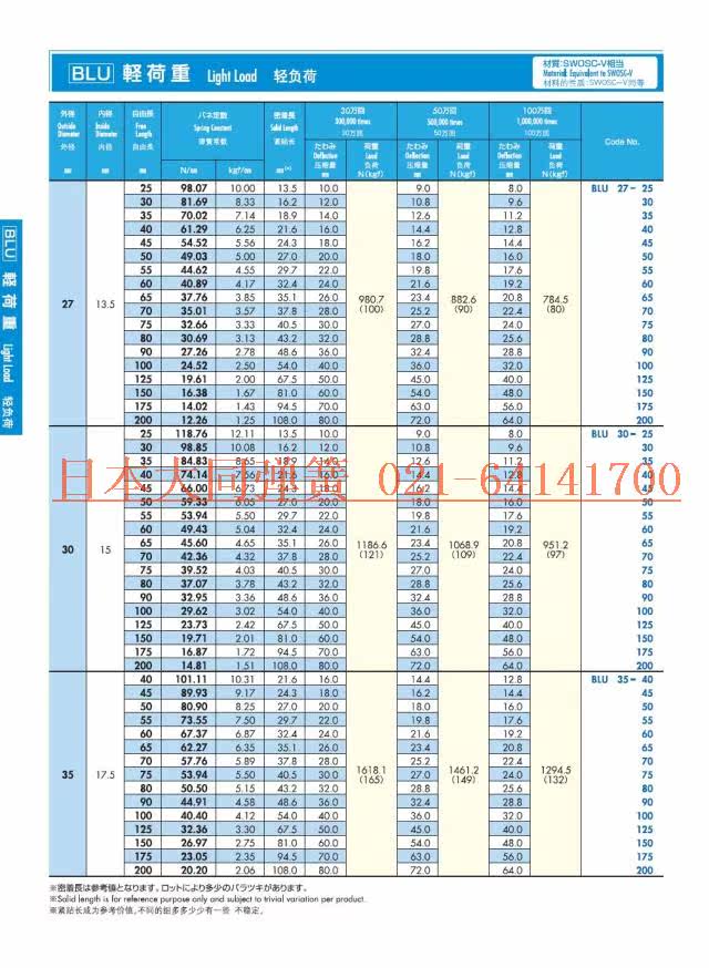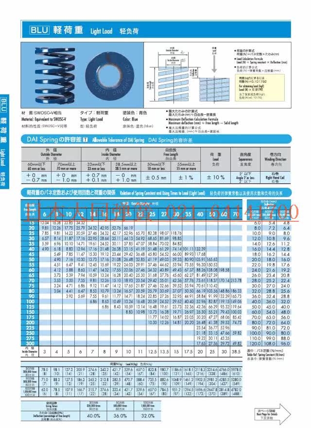 ■日本大同彈簧有輕小負荷、輕負荷、中負荷、重負荷、超重荷重和極重荷重六種規格,對應顏色為黃、藍、紅、綠、茶、黑。彈簧標準規格為Ф6×60mm~Ф70×300mm