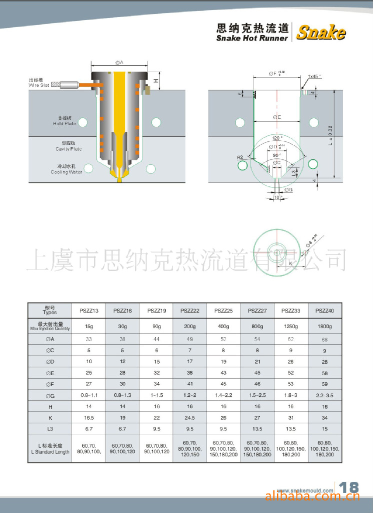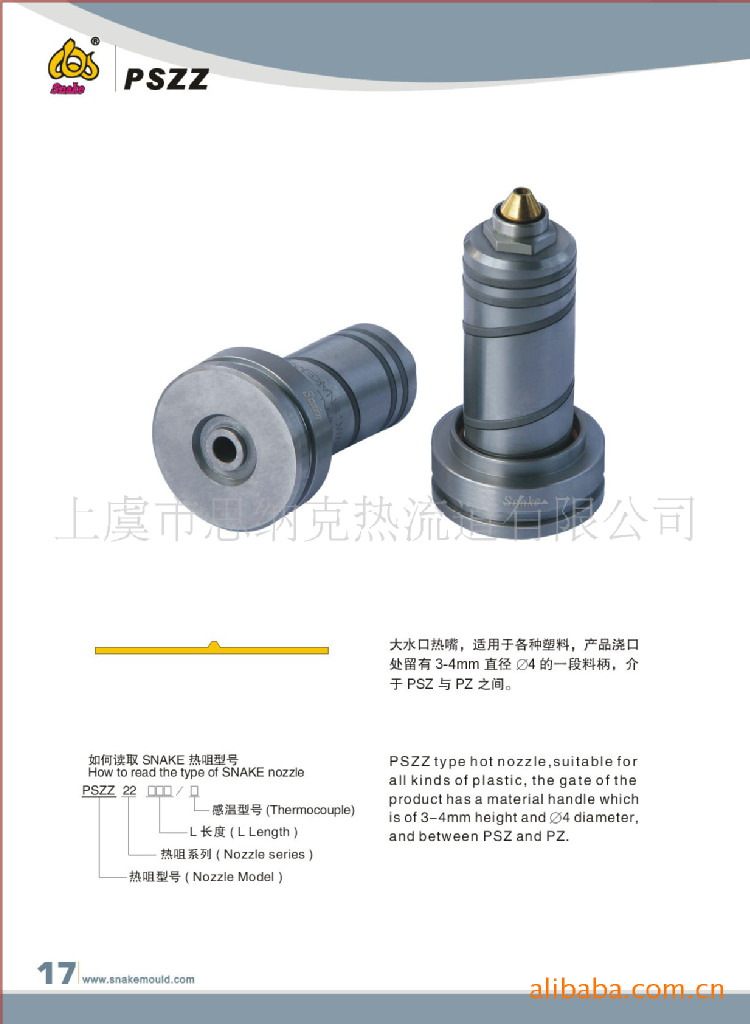 PSZZ type hot nozzle,suitable for all kinds of plastic,the gate of the product has a material handle which is of 3-4mm height and diameter 4,and between PSZ and PZ.