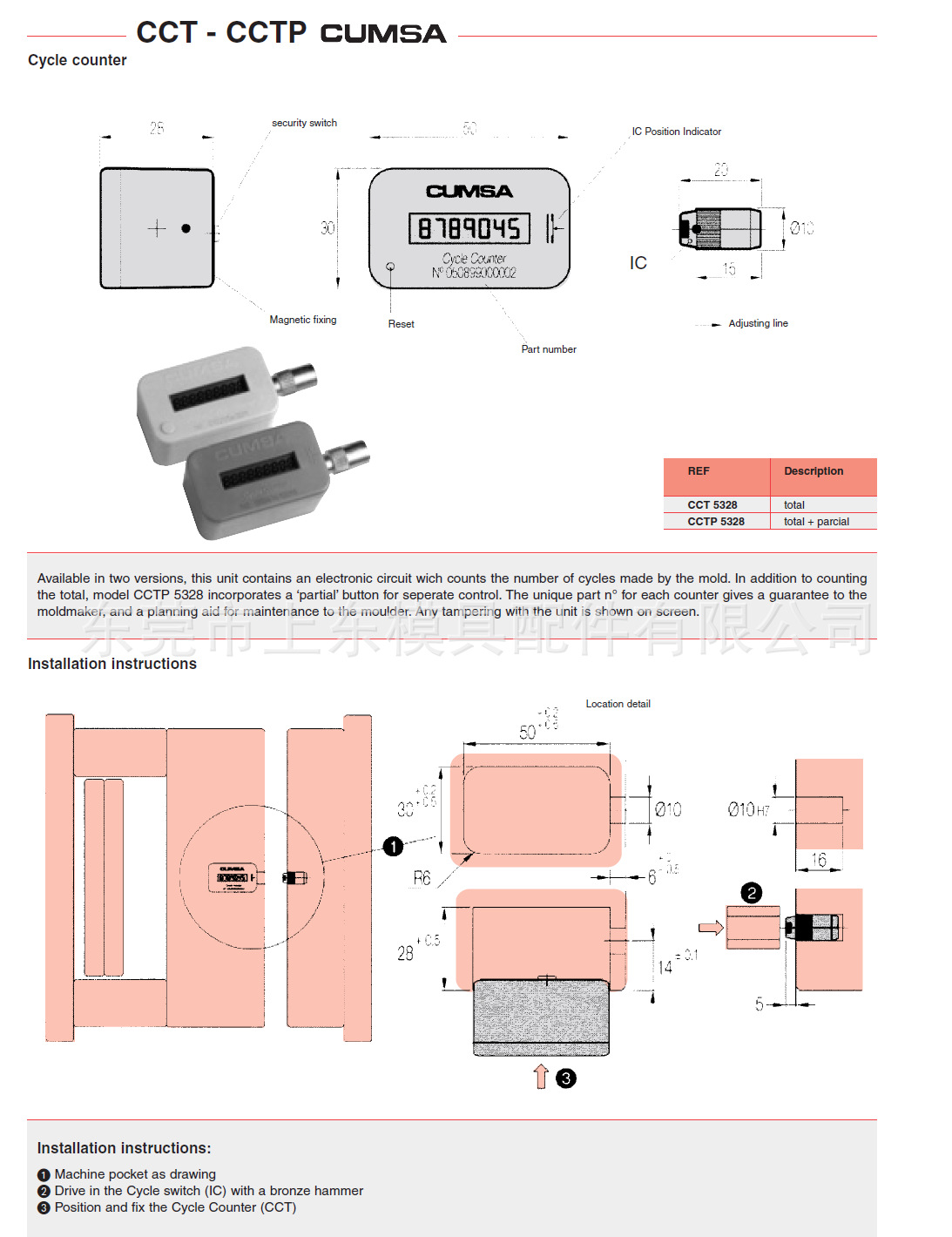 CUMSA電子式計數器是西班牙CUMSA公司自主研發的一款專利產品。材質:ABS,可耐模溫60度,分為CC.503028和CC.RE5328兩種規格型號。CC.503028僅記錄全部開模次數,CC.RE5328可記錄全部開模次數,同時也能實現區段規零功能,均為7位電子記數。連續記數超過24次後,記錄的總數不能歸零。可準確的記錄模具的開模次數,穩定耐用。每個產品都由計數器本體,活動感應I(銅粒)兩個主要部件組成。CC.5RE5328比CC.5503028多瞭一個區段清零的按鍵在顯示屏的左下端。