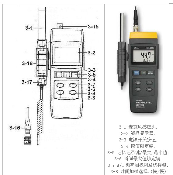 功能 | dB A/dB C加權網路.時間加權(快/慢).讀值鎖定.記憶(最大值.最小值).峰值鎖定.AC電壓信號輸出.RS-232信號輸出. |