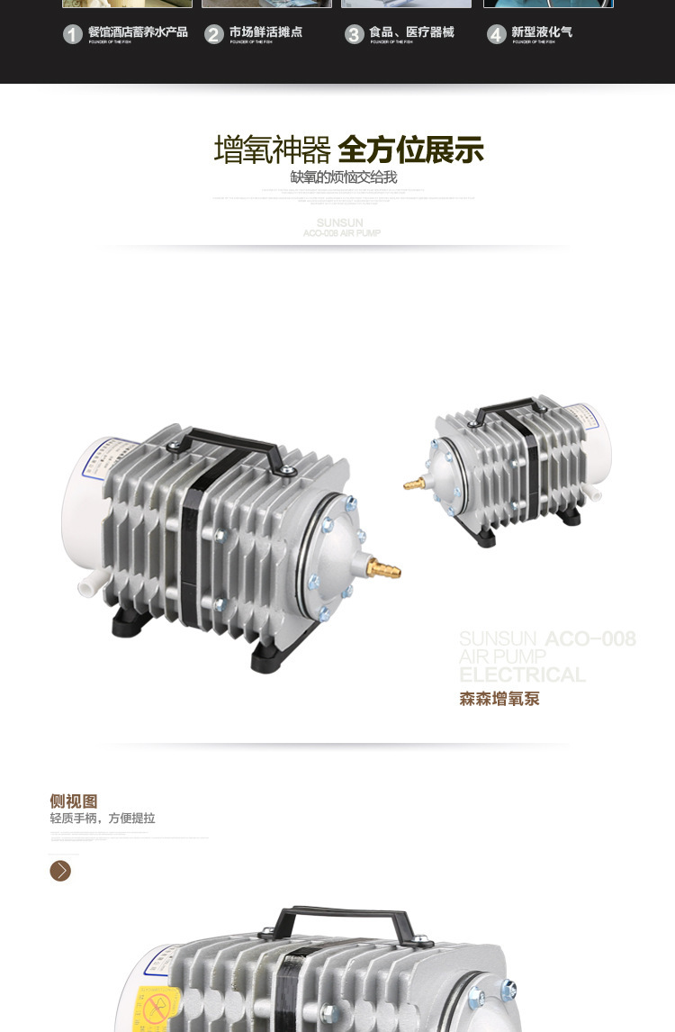 適用於水產培苗養殖及酒店、賓館蓄養鮮活水產品的加氣增氧、市場活鮮攤點、養魚等,也可作為食品機械、醫療