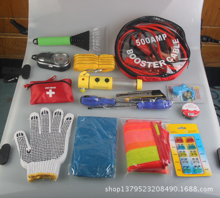 長方包;搭火線,拖車繩,4合1安全錘,雪鏟,一字,十字,美工刀,胎壓表,電工膠帶,雨衣,保險絲,手套,瞌睡寶,反光背心,醫療包。價格80元
