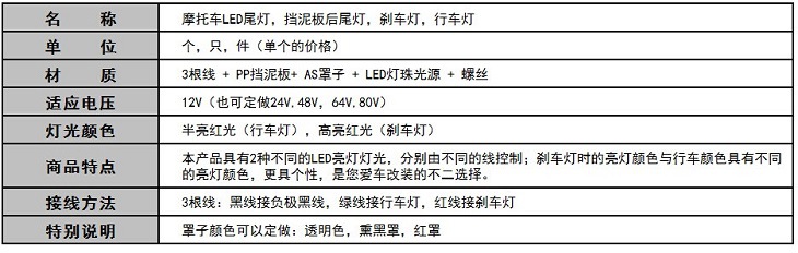 . 多功能:作為摩托車後尾燈,它還同時兼備剎車燈,行車燈,擋泥板功能。