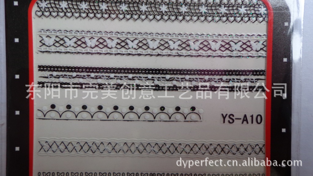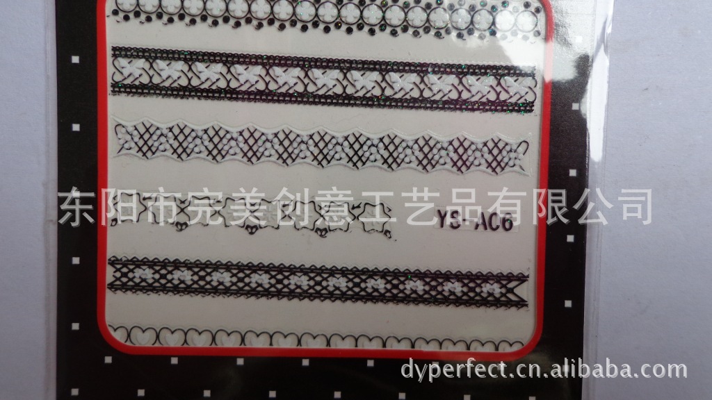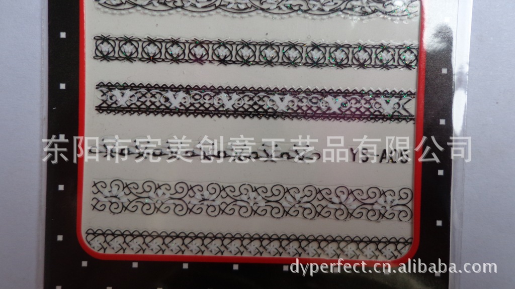 我公司供應各種指甲貼紙,精美包裝,符合時尚,圖案多樣,品種多樣,試貼效果逼真。我公司主要指甲貼分類有:水性普通貼花系列、水性蔥粉貼花系列、水性燙金貼花系列、3D發泡燙金系列、3D燙金貼花系列、3D蕾絲系列、2D閃粉指甲貼、3D水晶指甲貼等。