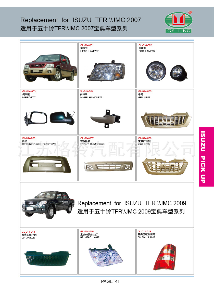 主要產品有:江鈴98款;福特全順系列;NHR、NKR、天皇100P系列;新江淮TFR92-97款系列;2001款慶鈴皮卡140系列;寶典;上海萬豐;陽光皮卡;北汽福田皮卡;北京1041新老款;東風153及輕卡1061系列等各種重輕型汽車燈具、車鏡、鏡桿、中網、保險杠、導流罩及全車塑料裝飾件。並可來圖來樣專業製造。以上產品均與江鈴、五十鈴、一汽、二汽等汽車生產廠傢配套,工貿合營,產品出口歐洲、中東及東南亞等國傢和地區,深受海內外用戶的信賴。