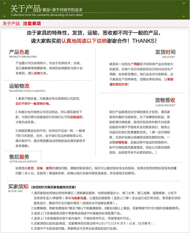 5、本店致力於運輸零破損,並始終以顧客權益為服務的最高考量。一旦出現運輸意外損壞或者您對商品有任何不滿與疑問,請毫不猶豫的第一時間聯系本店,我們將盡全力確保您的利益並真誠為您解決問題。