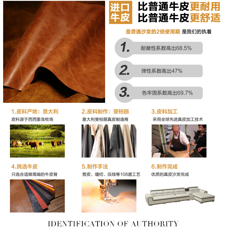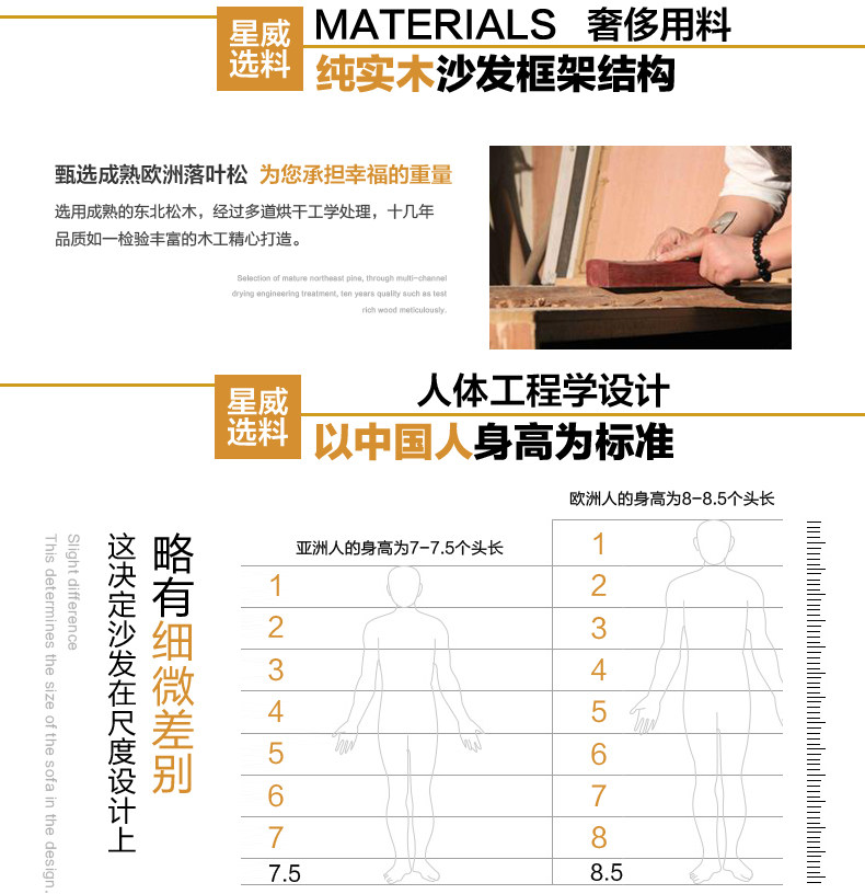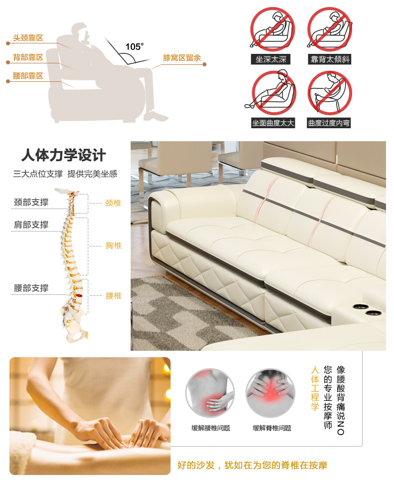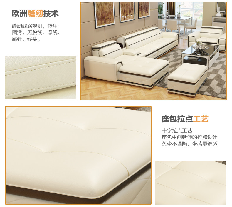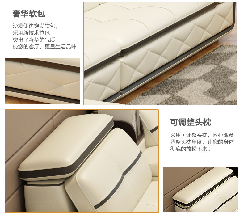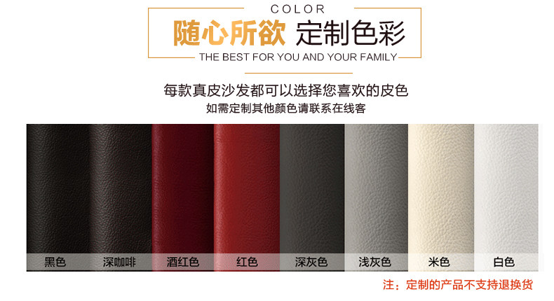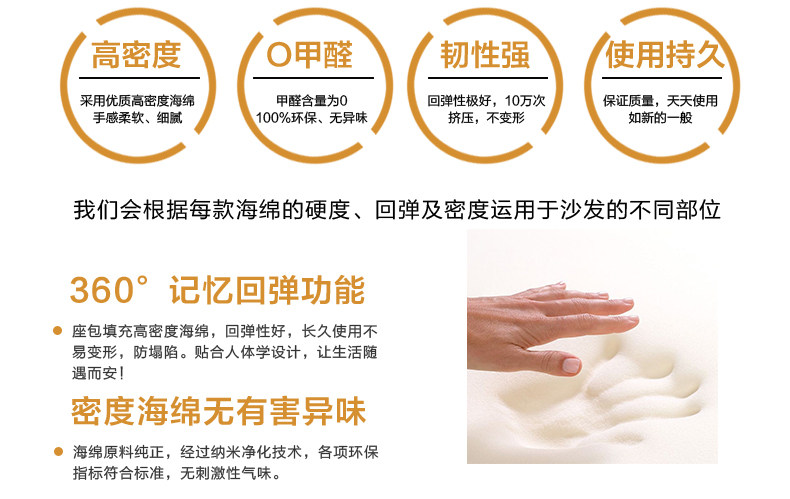 | 【主材質】 | 1.沙發坐麵和靠麵為頭層真皮,堅韌舒適 2.沙發框架采用實木框架,床頭以木方製成,夾板封閉 3.沙發座位采用進口蛇形彈簧支撐座包,坐墊內含弓字彈簧,彈 性十足 4.沙發采用三層海綿填充,保證坐感,無論仰坐還是側坐,促進 血液循環,緩解疲勞。 | ||