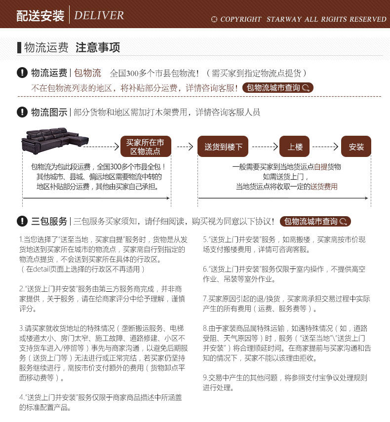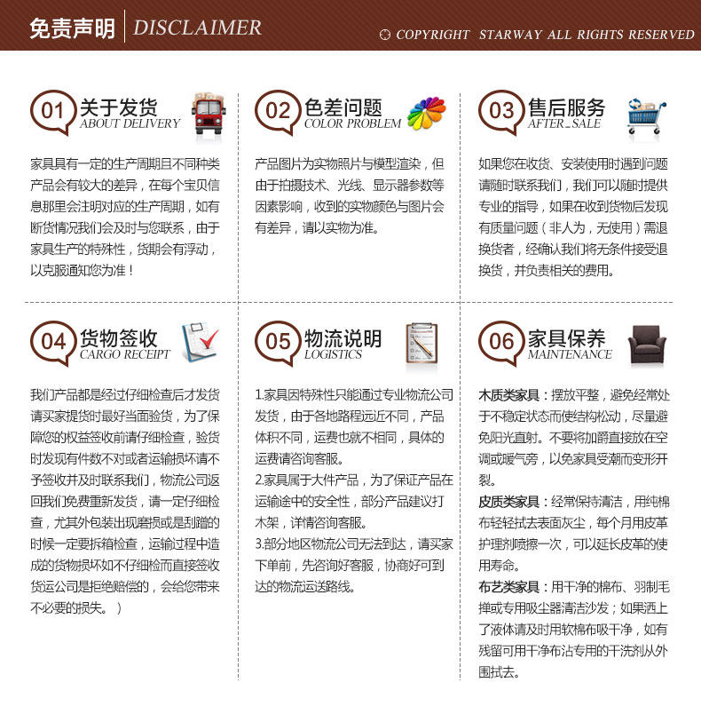 | 【生產周期】 | 傢具生產需要一定周期,發貨時間請以與客服協商為準,同時為保 障發貨信息無誤及準時發貨請保持旺旺及電話暢通 | ||