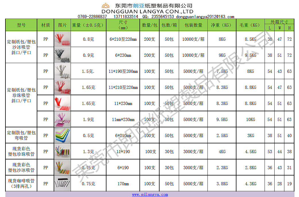 朗亞紙塑是一傢專業生產、銷售一次性飲料吸管的廠傢,主要采用食品級PP粒料,生產不同規格、形狀、顏色的各類飲料吸管,如:彎管、直管、沙冰管、珍珠奶茶管、藝術管、汽水管等;直徑3-12mm,長度10-25CM,品種齊全,可按客戶要求印刷包裝定做單支塑料包裝、單支紙包裝、多支薄膜袋等各種吸管,定做數量低至5萬支起。