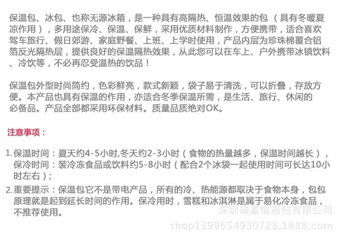 重要提示:保溫包不是帶電產品,所有的冷、熱能源都取決於食物本身,包包原理就是起到延長時間的作用。保冷用時,雪糕和冰淇淋是屬於易化冷凍食品,不推薦使用。