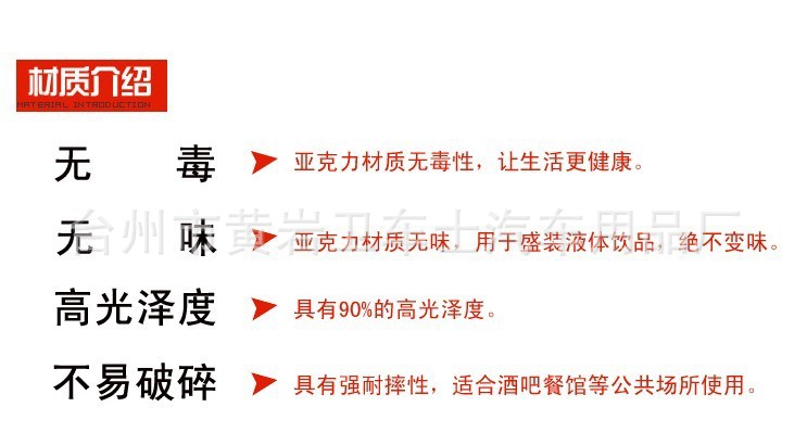 具有玻璃般的晶瑩透明,卻不會破碎,耀眼的杯身更顯高貴,設計結構輕巧易於拿放,是酒吧,的廳,酒店,遊泳池等公共場所的最佳飲用器具。