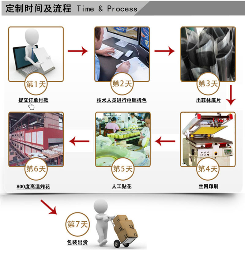3.打樣確認:圖稿、款式、數量、價格、包裝、打樣費、交貨時間確認後,即可進入打樣階段,打樣費支付給我司後,我司安排打樣。通常打樣時間為5-7天,杯款若需開模,時間則為10-15天。(如我司現有器型無需打樣費)