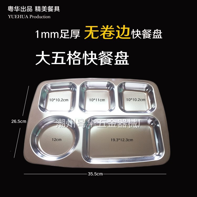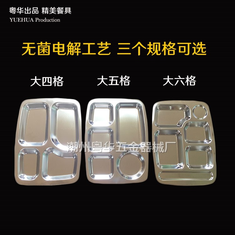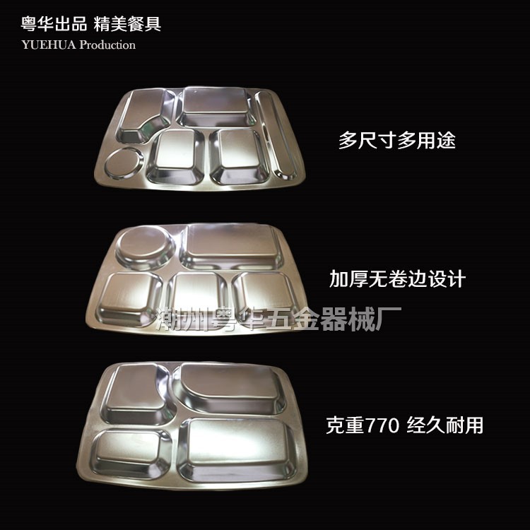 產品名稱 不銹快餐盤 產品規格 大四格、大五格、大六格 產品貨號 YH-KCP 單位 個 產品重量 咨詢客服 產品材質 無磁201 產品包裝 內薄膜袋 外紙箱 用途 學校食堂、工廠飯堂、快餐店等等 品名 貨號 長度(cm) 寬度(cm) 深度(cm) 厚度(mm) 重量(g) 裝箱數 箱規(長*寬*高cm) 大四格 YH-KCP-4 35.5 26.5 2.2 1mm足 775g 50 37×28×15 大五格 YH-KCP-5 35.5 26.5 2.2 1mm足 775g 50 37×28×18 大六格 YH-KCP-6 35.5 26.5 2.2 1mm足 775g 50 37×28×15