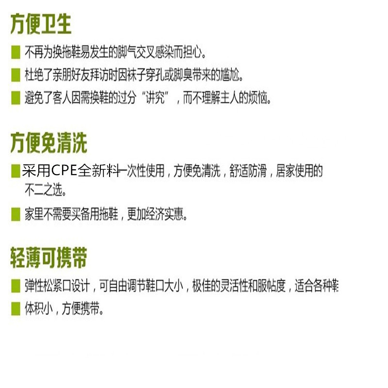 產品介紹:CPE鞋套具有韌性好、耐磨、柔軟等特點, 可以防塵,防止腳臭等各種異味。廣泛用於傢庭、賓館、醫院、電子廠、製藥廠、器械廠、電腦機房等工作環境場所使用。主要用來隔離人體鞋子對生產環境的污染,同時也方便客人進出車間參觀時使用。