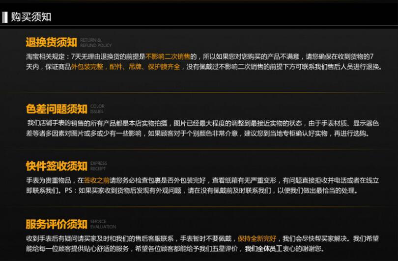 質量問題范圍:表盤破裂,掉鉆,表帶斷裂,指針不走,但不包含(更換電池正常走針),其他一律不視為質量問題,人為損壞一律不退換!