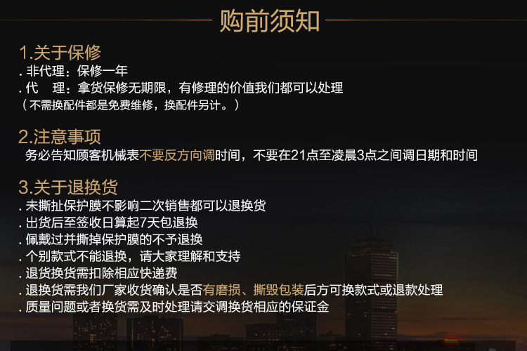 包裝情況: | 所有手錶均不帶表盒發貨,若需表盒,麻煩每個表盒加多一元錢 |