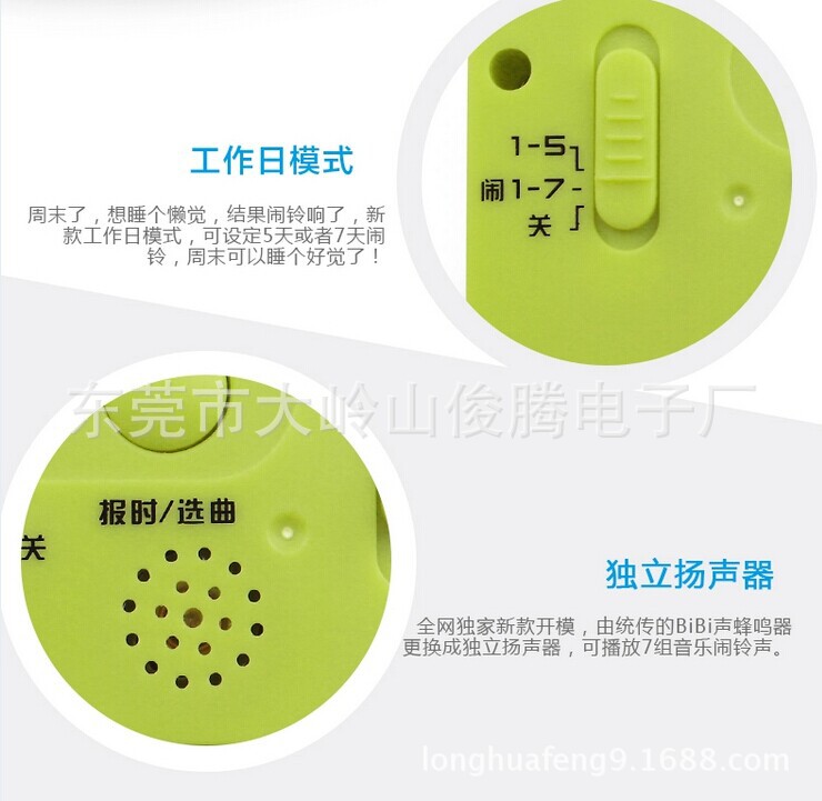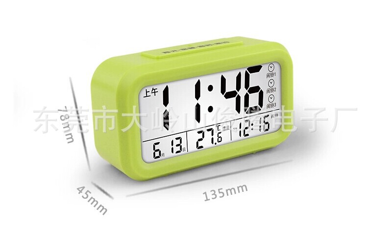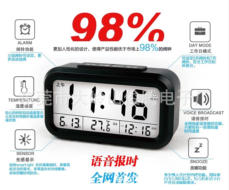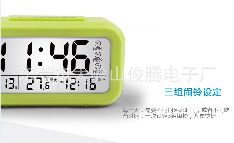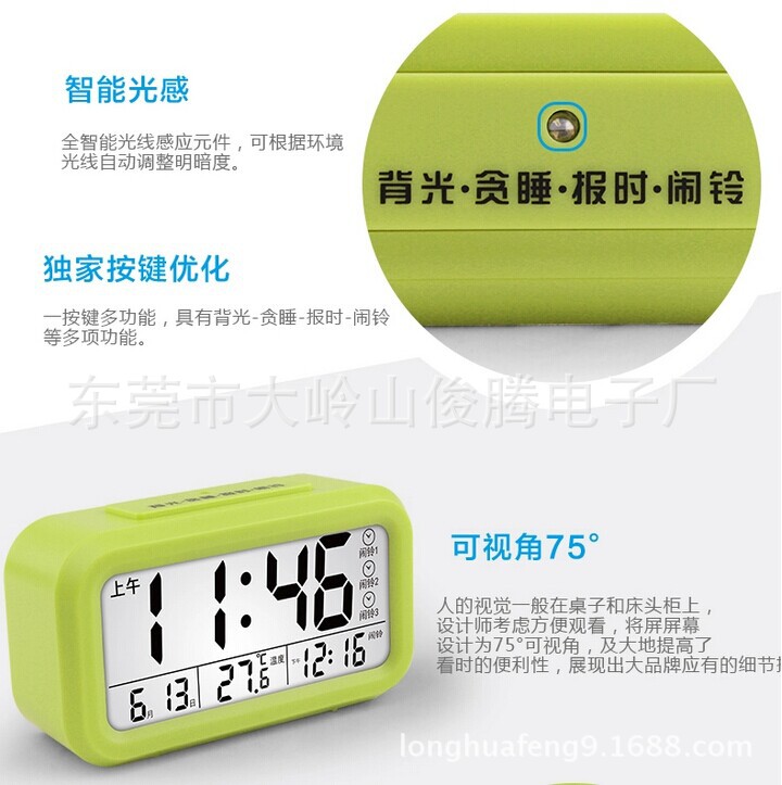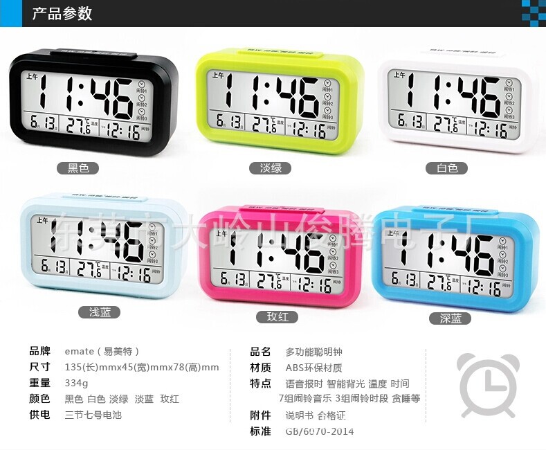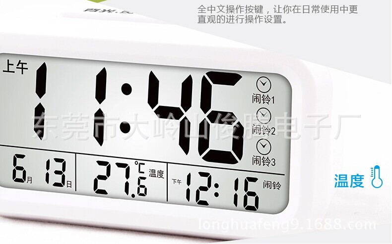 - 功能: 帶背光 貪睡功能,工作日鬧鈴,溫度顯示