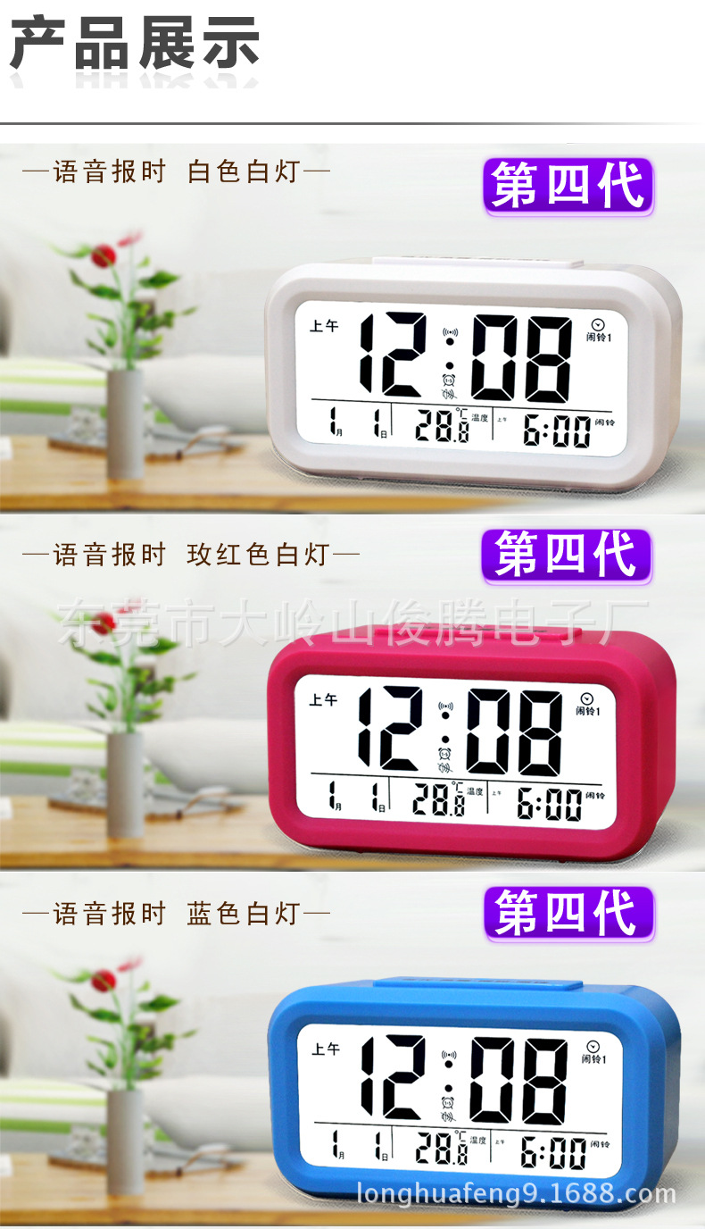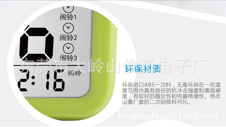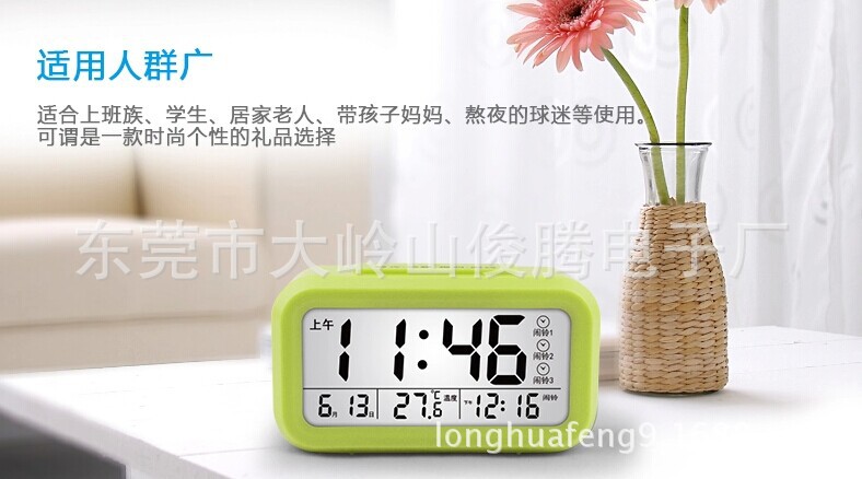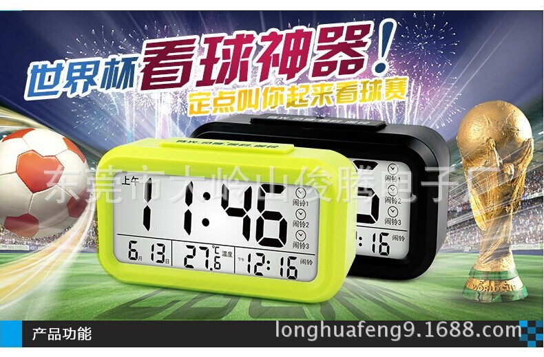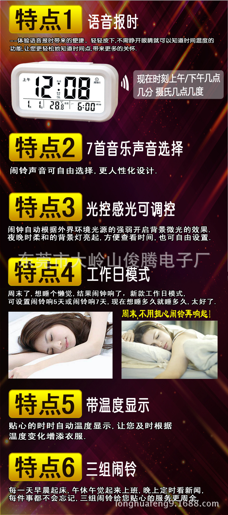 - 功能: 帶背光 貪睡功能,工作日鬧鈴,溫度顯示