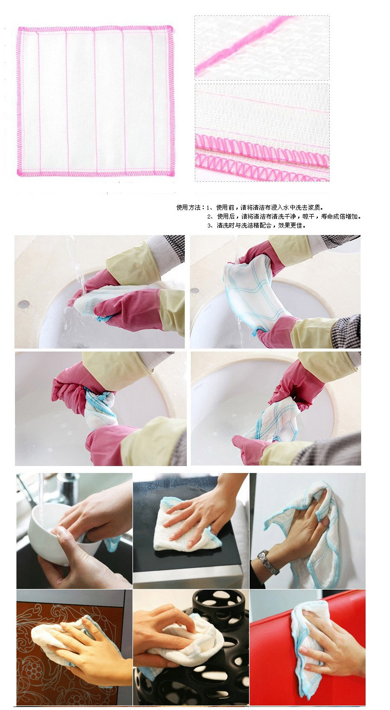 無靜電,柔軟,透氣性好,利水利汗,吸水性強,使用壽命長,能抑製細菌的滋生和繁衍,用完後在清水中輕輕一搓,即可乾凈如初,如油污較多時,可用開水或熱水搓洗即可,本品還具有潔凈,不怕高溫,無污染等特點.