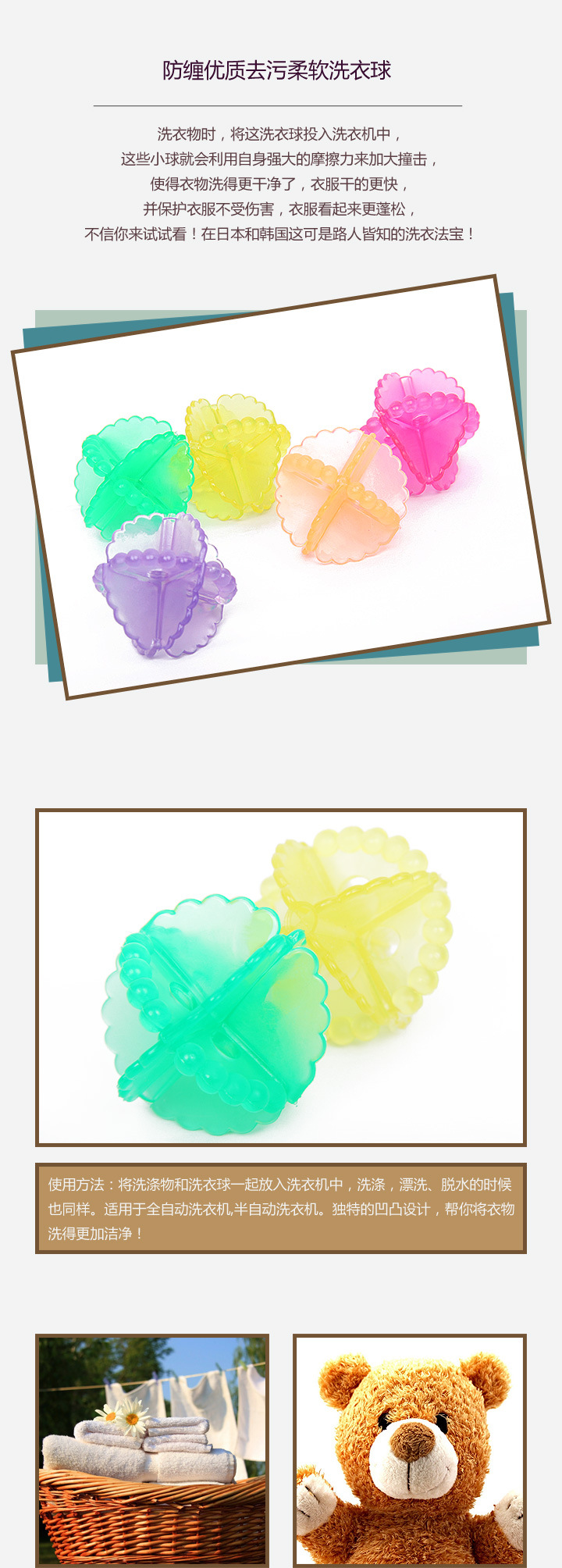 使用方法:將洗滌物和洗衣球一起放入洗衣機中,洗滌,漂洗、脫水的時候也同樣。適用於全自動洗衣機,半自動洗衣機。獨特的凹凸設計,幫你將衣物洗得更加潔凈