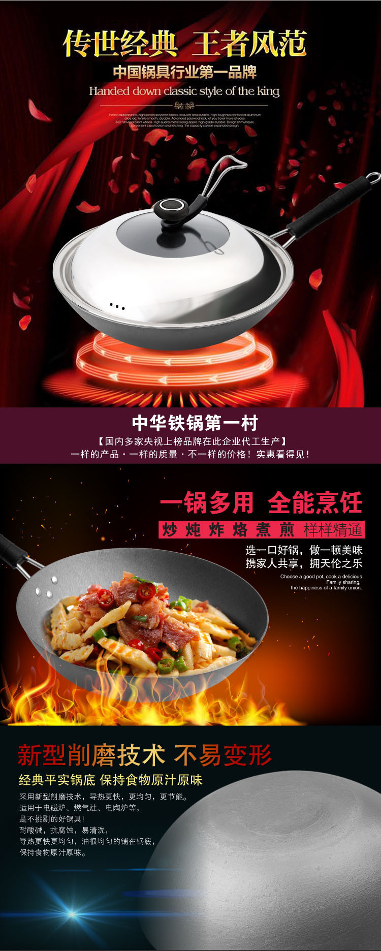 此外,不粘鍋表麵被鏟子刮擦,四氟化碳會掉落到食物中被人直接吃進肚裡去。傳統鐵鍋沒有這種化學物質塗層,自然也不存在這種危險性。 - 用鐵鍋炒菜能補充鐵元素。高溫下,鐵鍋中的少量鐵元素會滲入到食物中,因此在客觀上起到瞭補鐵的作用。
