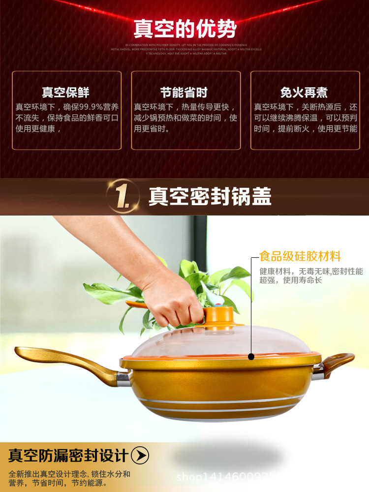 本款黃金真空養生鍋采用進口塗層 安全無害 標準直徑32CM適合3-7人傢庭享用,送竹鏟!!!煎,烤。炒。煮。煲樣樣都行。而且沒有油煙。又不沾鍋。做出的美食原汁原味。營養不流失。最主要的是節能省電。比普通的炒鍋省電50%。多層復合底。不挑爐子。導熱快。受熱均勻。夏天特別好。食物做好都不用在放冰箱裡。放在鍋裡就可以。能保鮮5天。保證不變質。