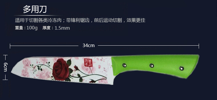 【使用說明】:多用刀:適用於切各類冷凍肉、帶骨雞,帶鋒利鋸齒,前後運動切割,效果更佳。切片刀:適用各種肉類、蔬菜切配,由於刃口較薄,請勿用於砍骨。蔬果刀:刀身輕巧,適用各種蔬菜、水果、去皮切片、切絲等。護手器:輕巧,方便.防止手被切到
