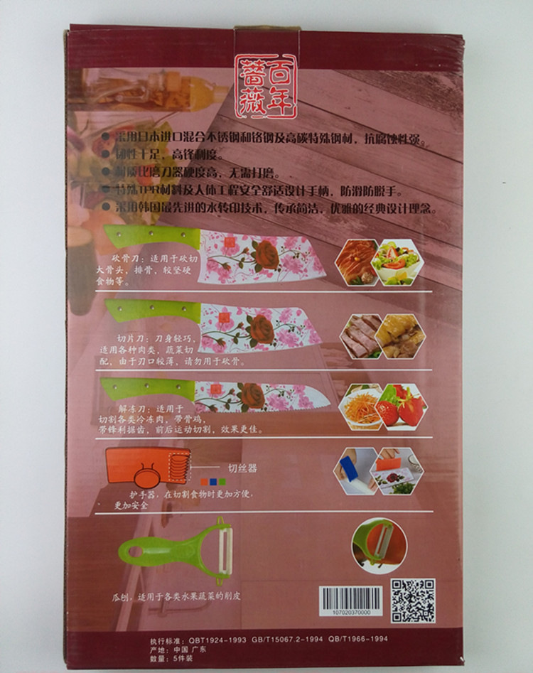 百年薔薇刀具傳承嶺南古老鑄刀技術,溶入現代精湛的製造工藝。並采用德國進口鎢碳鋼,經過多次鍛打淬火,加上先進的水轉印技術,精製而成。百年薔薇刀具具有耐高溫、耐低寒、抗酸堿、耐腐蝕、抗沖擊、耐摩擦,是傢居必備,饋贈親友的首選禮品。刀刃鋒利無比,無需再磨,極其耐久;