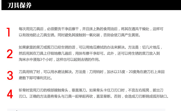 【使用註意】:刀具使用後,請洗凈拭乾後再收藏。為延長刀具使用壽命,請勿直接在廚房瓷磚或料理臺上切割食品。為安全起見,任何掉落中的刀具請勿用手承接。請勿以手指測試刀鋒的銳利度。刀具放置及收藏請遠離孩童易於觸碰之場所