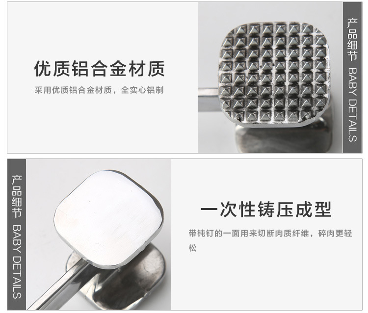 烹肉的好幫手。當您想烹製肉食美味時,還在使用刀背去敲打?弄得肉未四濺嗎?您還在使用不利於健康的食品添加劑和油浸泡肉類食品使其入味嗎?當您想為小寶寶製作一道富有營養的瘦肉食品食,還在為寶寶無法咀嚼而感到難主嗎?這款肉錘可以解決全部的問題,使您的美食更加細嫩。