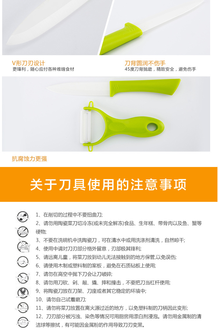 3.使用它來切食物和水果,也不會留下任何的異味。具有超高硬度,超高耐磨性,並且耐腐蝕永不生銹,不導電,不傳熱,無磁性,刃口鋒利,表麵潔白光滑,使用輕松省力,不沾粘稠液體,易清洗等特點。