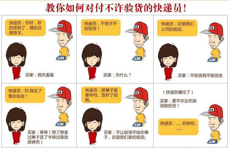 根據目前國內大部分快遞派送貨人員隻送到小區門房、門衛、保安、學校或公司傳達室等等,這些都默認是本人簽收,所以請購買前先知會代為檢查無誤再簽字。