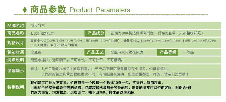 竹席選用“中國竹鄉安吉”優質深山成年毛竹,精製成竹絲,竹絲經過高溫熏蒸烘乾、保色、防蛀等多道工序,編織加工而成寶貝,寶貝外表美觀,做工精細,手感爽滑不刺手,透氣性好,四周鑲邊,更精美,雙層折疊設計攜帶冬天收藏都十分方便.炎炎夏日使用,清涼宜人,消除疲勞,促進睡眠;是你夏季傢居必備,更是饋贈親友的極佳禮品,真真正正值得你選用的優質睡眠好伴侶。