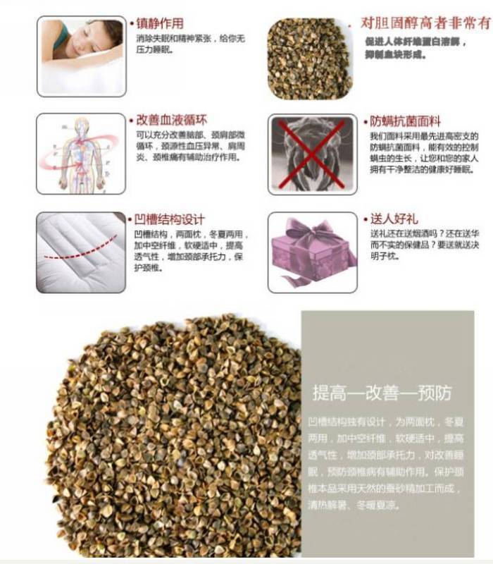 *蕎麥枕頭功效二:蕎麥枕是用蕎麥殼做枕芯的填充物,由於蕎麥殼獨的構造,其具有良好的透氣性,和永不變形,可塑性強,冬暖夏涼.中藥典記載:“蕎麥殼清腦、明目,對失眠、 多夢、頭暈、耳鳴等疾具適當效果”。據<<本草綱目記載,使用蕎麥枕頭能至老明目,清熱安神,促進睡眠等.