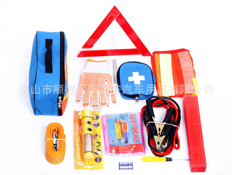 拖車繩、多功能安全錘、胎壓計、反光警示衣、雨衣、醫用急救包、強光手電、電瓶線、打氣泵、三角警示牌 補胎膠 手套 鉗子螺絲刀等等多重工具可以根據需要來做相應搭配。